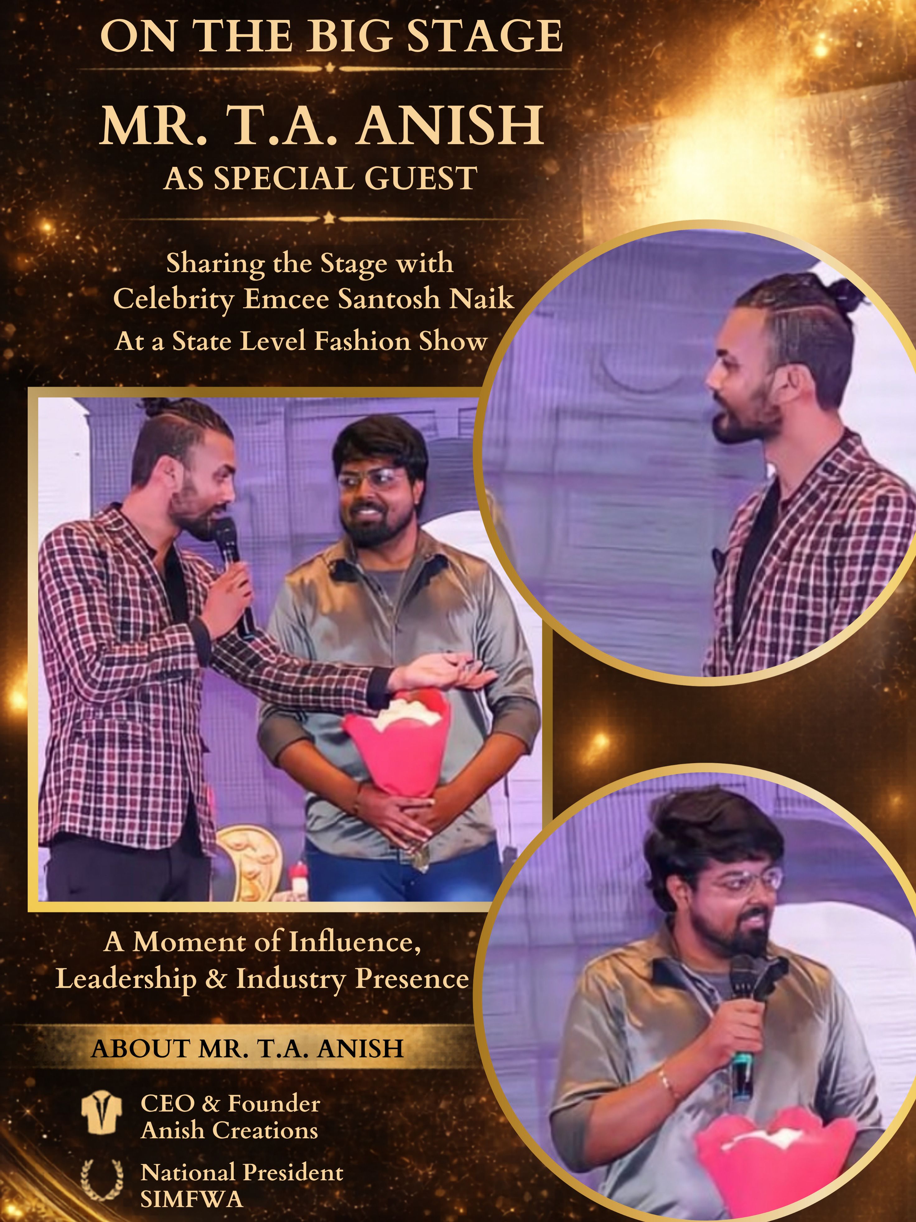 The special guest appearance of T.A. Anish at a state-level fashion show stands as a strong example of leadership and influence in the modelling industry. Sharing the stage with Santosh Naik, the event showcased the importance of experience, recognition, and professional presence in building impactful fashion events.